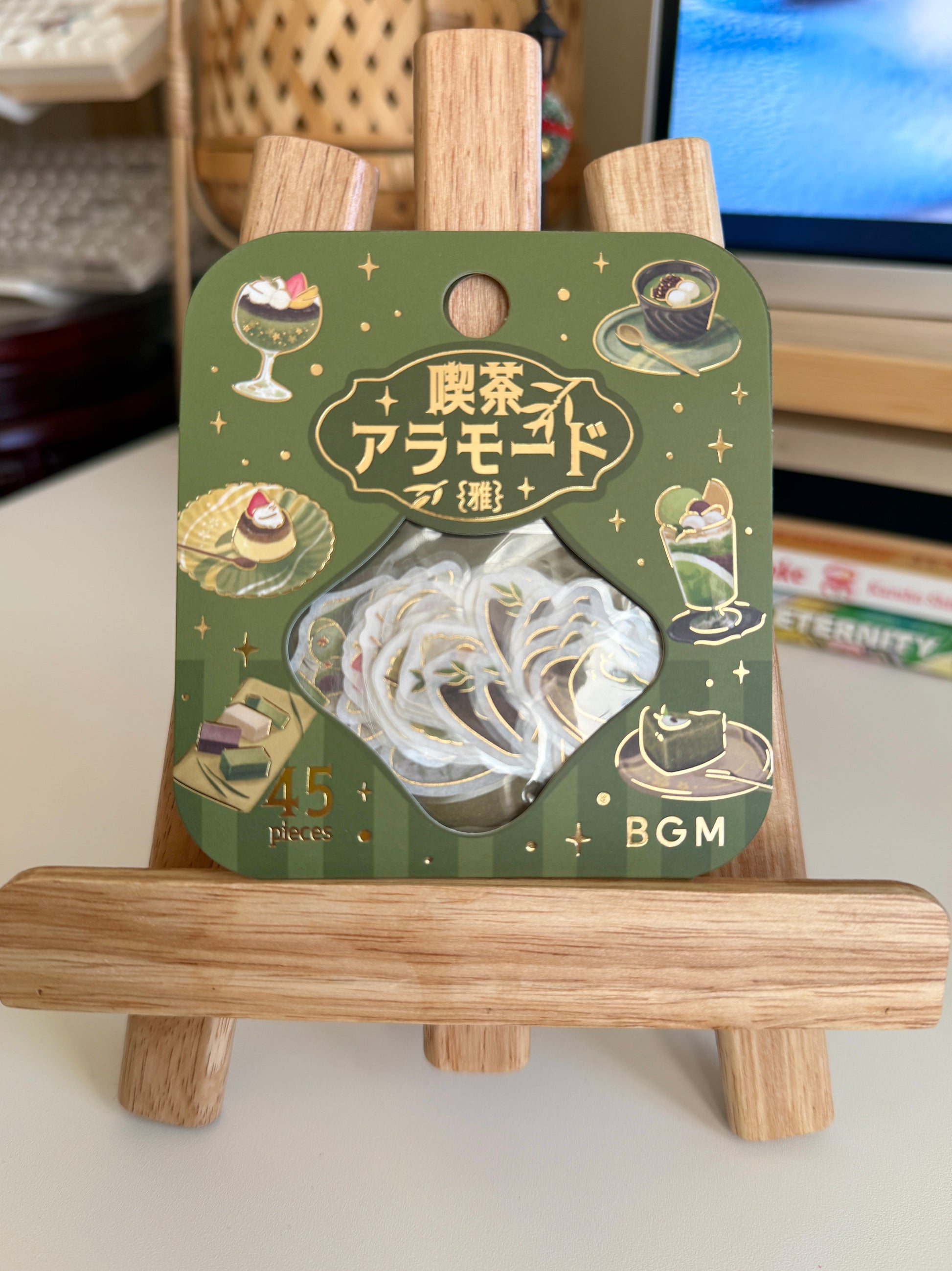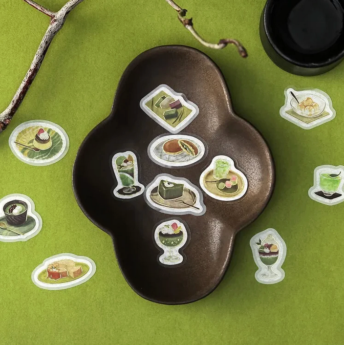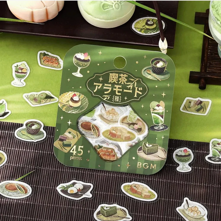 Café Ala Mode – Miyabi Matsuba draws inspiration from the soothing hues of green tea and matcha, capturing a refined and tranquil café atmosphere. This BGM foil stamping flake seal set features delicately illustrated Japanese desserts and drinks, finished with elegant metallic foil accents for a gentle shimmer. Ideal for notebooks, planners, and letters, these stickers add a subtle touch of Japanese café charm to your everyday stationery.
