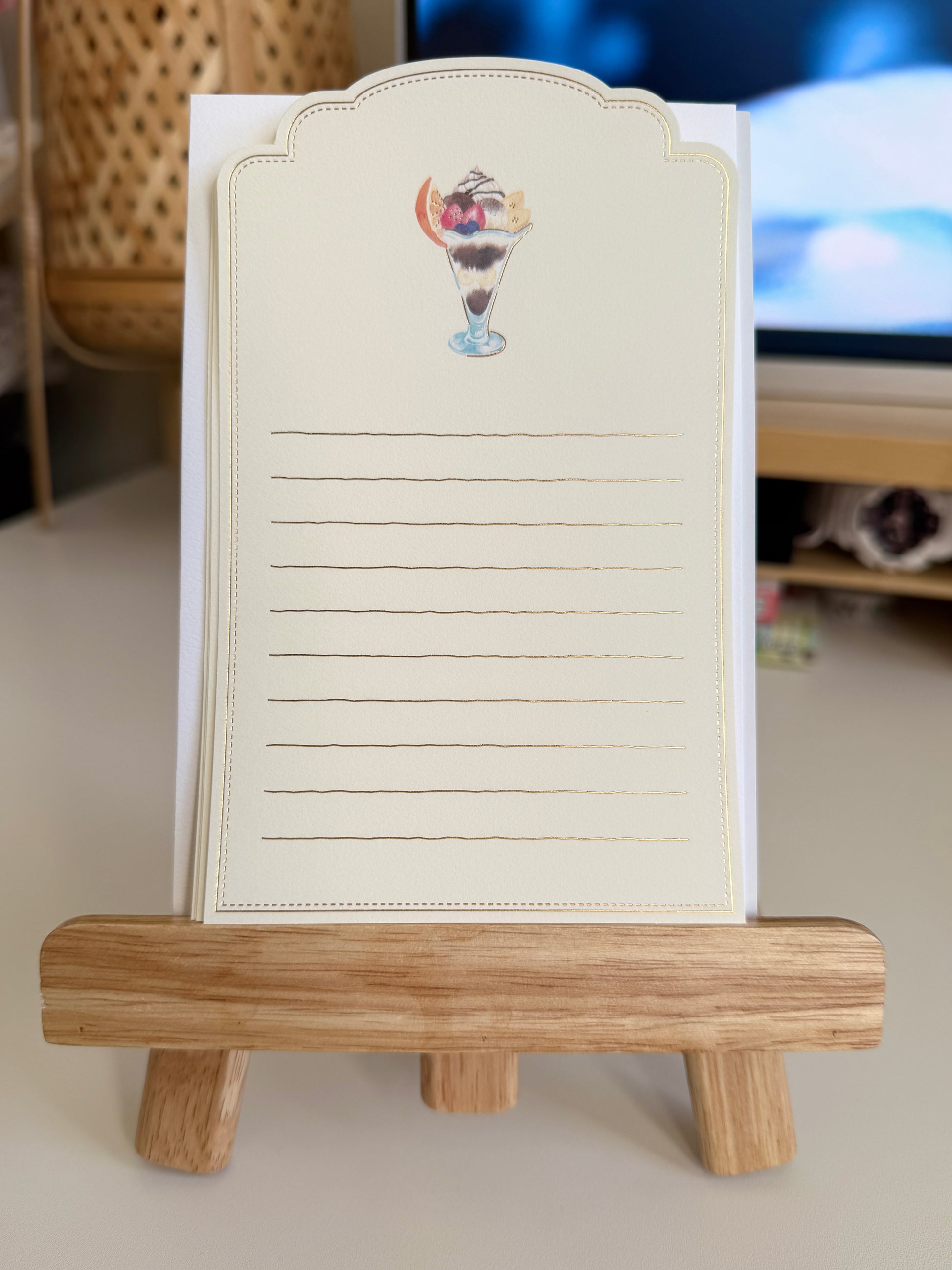This charming dessert-themed letter set adds a sweet touch to your handwritten notes. Featuring a vintage-style parfait illustration on scalloped stationery and matching grid-paper mini sheets adorned with a cozy pancake motif, the set blends warm café aesthetics with soft neutral tones.
